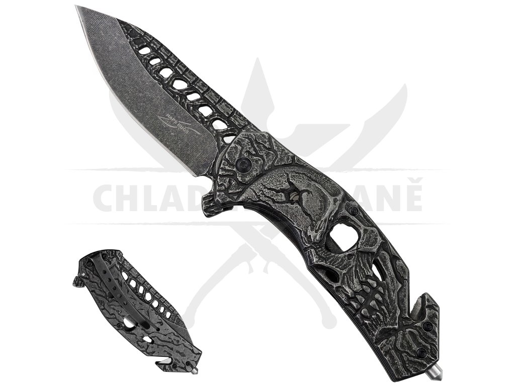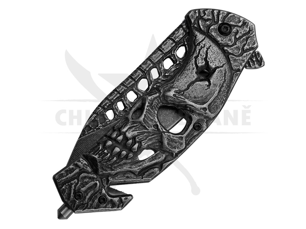 Rukojeť je jako čepel z nerezové oceli kovu a zdobená 3D reliéfem lebky a popraskaného povrchu. Díky promyšlenému tvarování dobře padne do ruky a umožňuje jistý úchop. V zadní části nechybí kovový hrot na rozbití skla a pevný kovový klip pro uchycení v kapse nebo na opasku.