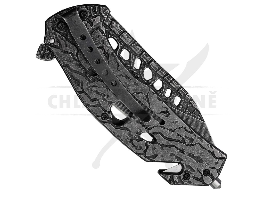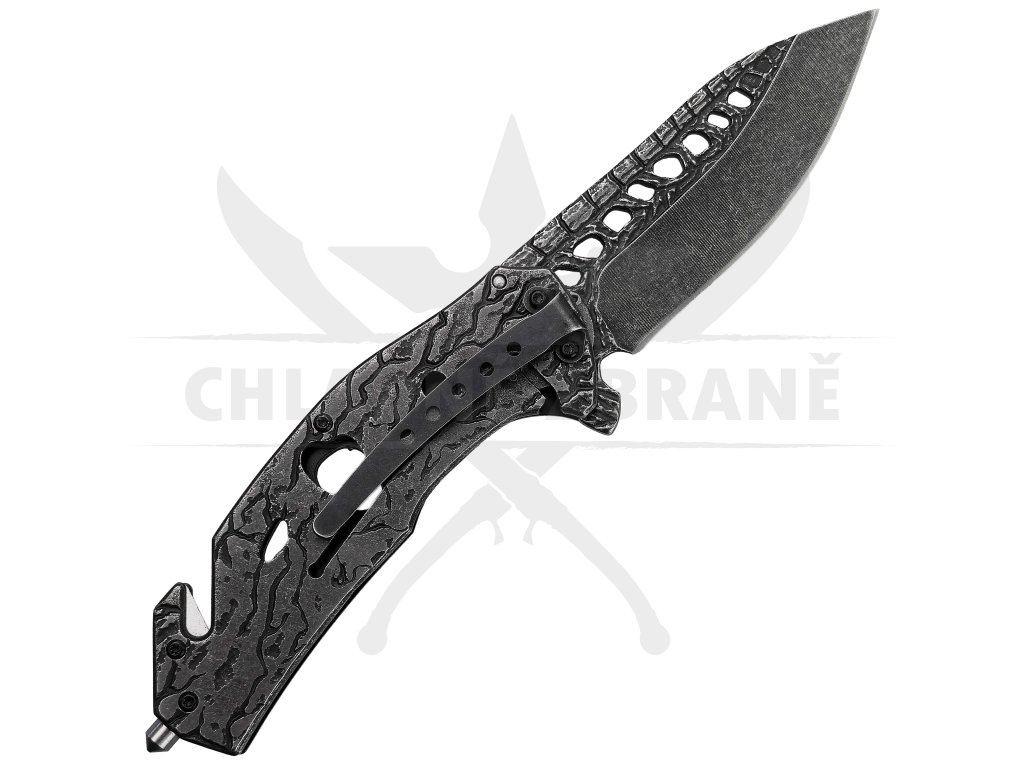 Masivní a zároveň detailně propracovaný zavírací nůž pro všechny, kdo ocení originální vzhled a funkční design. Čepel z nerezové oceli s matnou povrchovou úpravou a ozdobnými výřezy působí odolně a technicky. Otevírání je rychlé a pohodlné díky poloautomatickému systému, nůž je vybaven pojistkou typu frame-lock, která drží čepel pevně na místě i při náročnějším použití.
