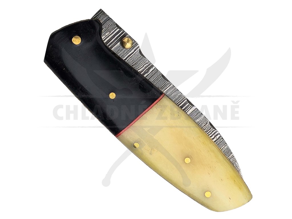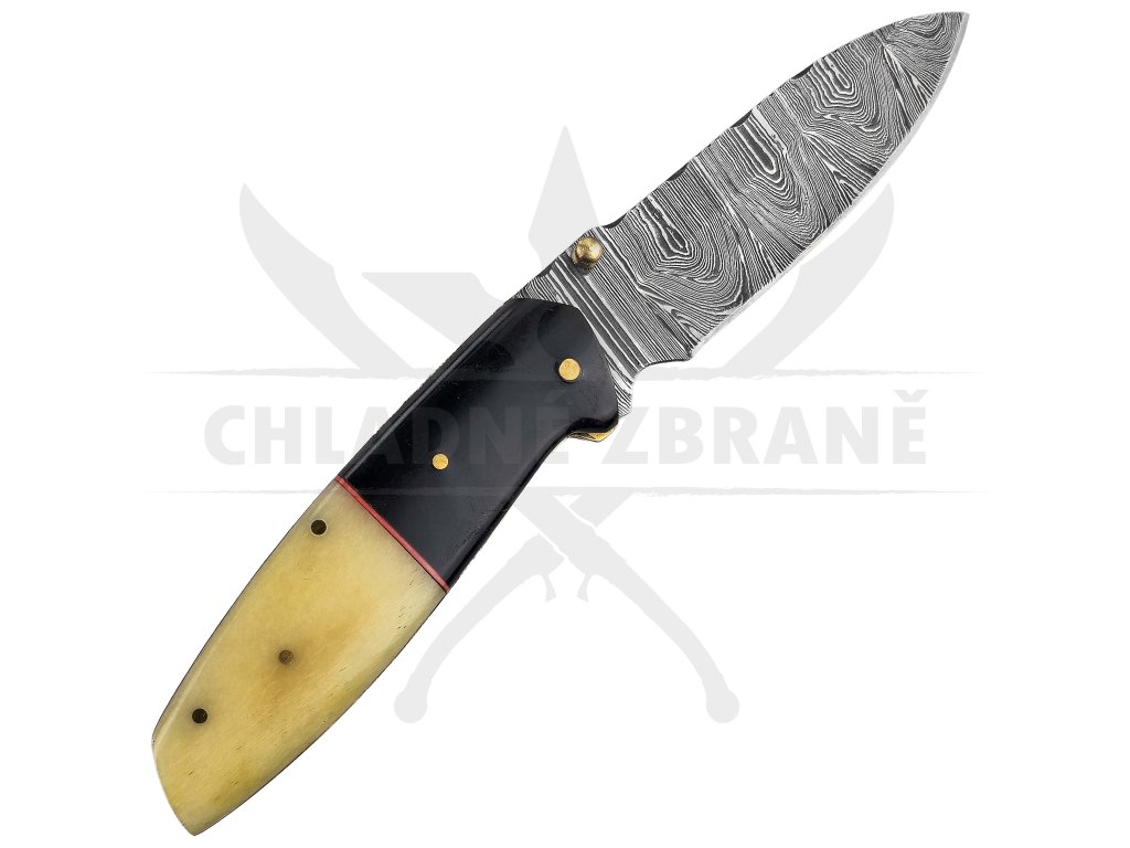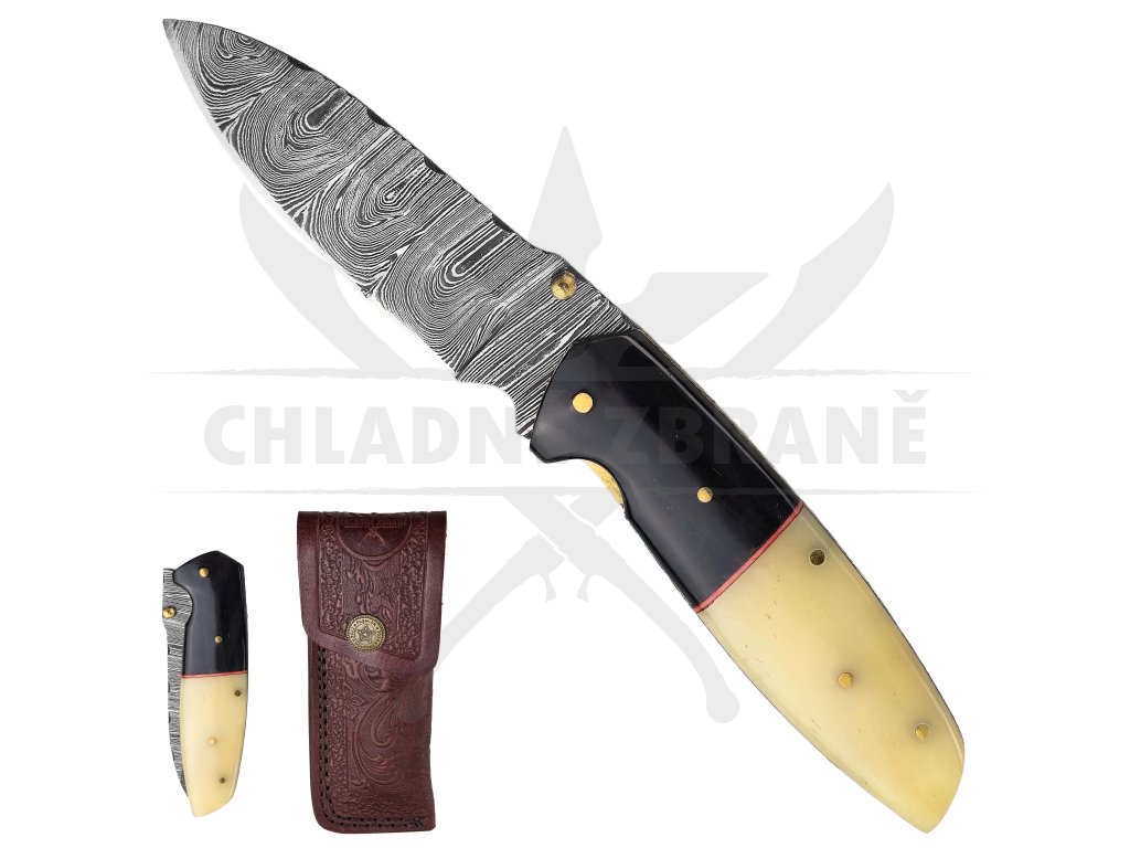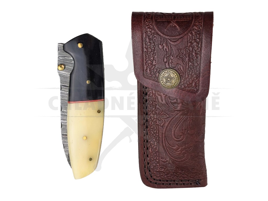 Zavírací damaškový nůž "BONEHORN" s koženým pouzdrem