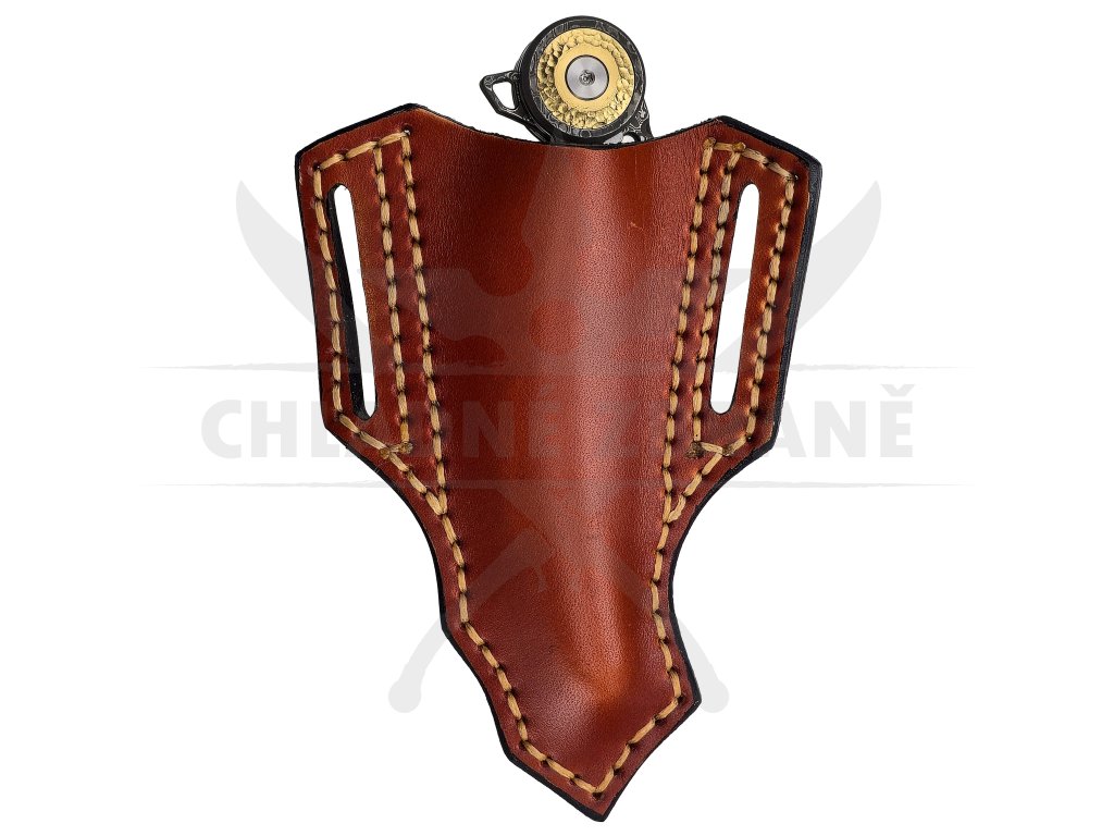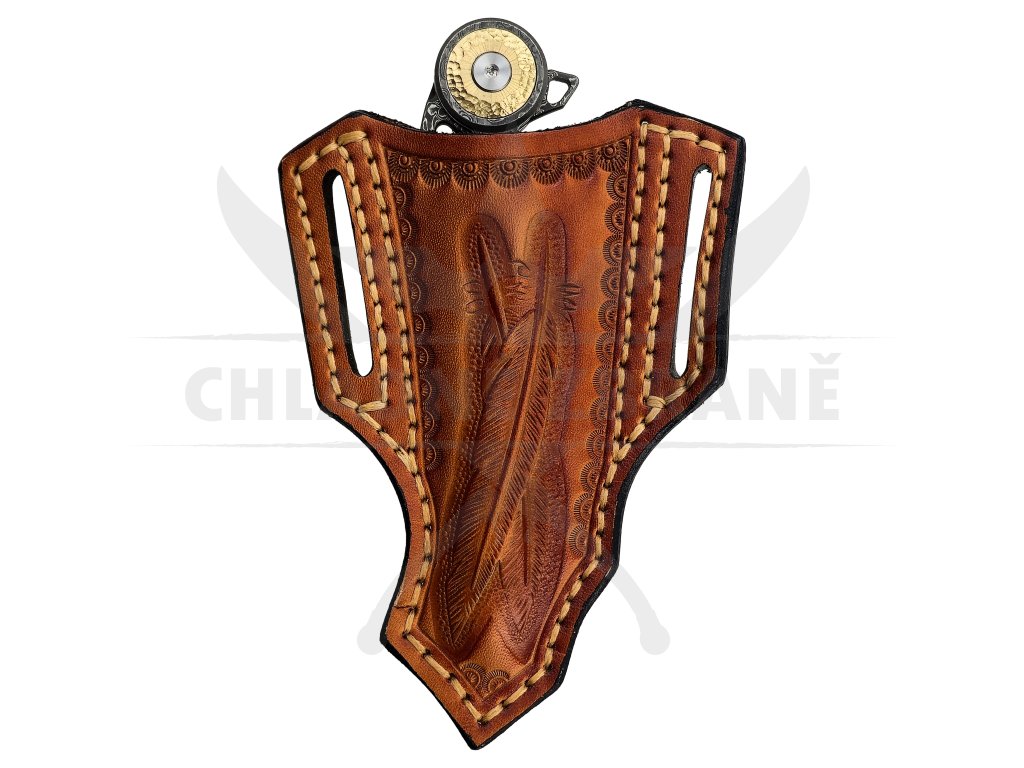 Rukojeť je doslova šperkem – tvoří ji kombinace ebenového dřeva, kované damaškové oceli a čisté mosazi. Každý detail působí luxusně a zároveň autenticky, s odkazem na přírodní symboliku, kterou podporuje i pouzdro z umělé kůže s reliéfem peří. To umožňuje pohodlné upevnění na opasek a dělá z nože nejen nástroj, ale i stylový doplněk.
